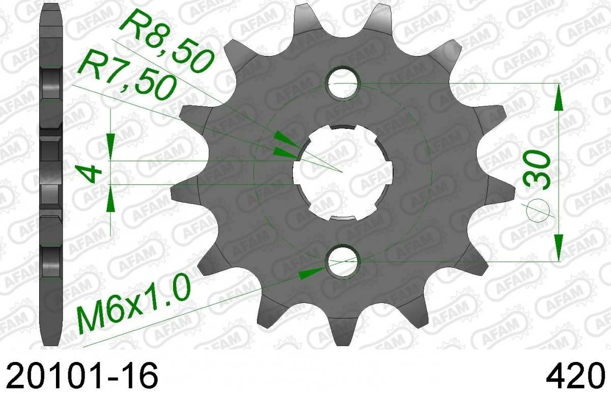 Een stalen 16 tands AFAM voortandwiel. De tandwielen van AFAM zijn gemaakt van C45 staal met inductie geharde tanden, het tandprofiel is concentrisch, plat en perfect rond. Door deze samenstelling zijn de AFAM tandwielen perfect ter vervanging of zelfs ter verbetering van de OEM tandwielen.
