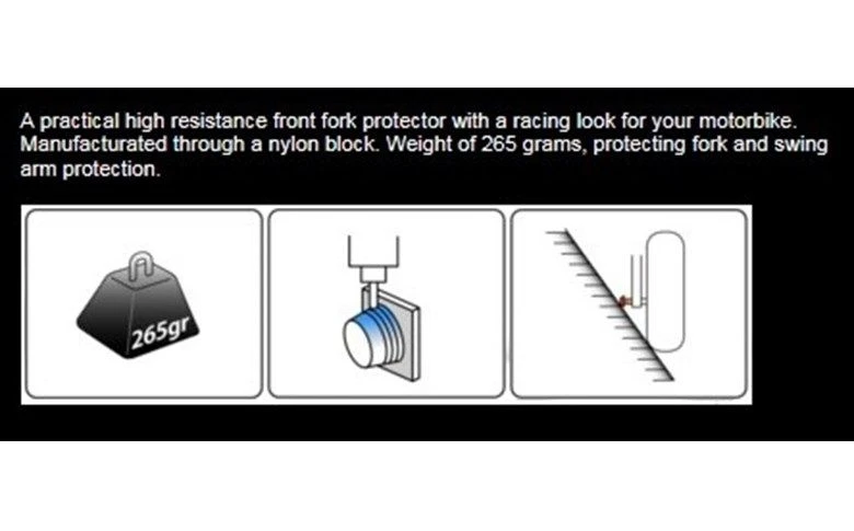 Een praktisch maar vooral slijtvaste voorvorkprotector met een racing look voor jouw motor. Deze protector is geproduceerd van nylon, weegt slechts 265 gram, is 40mm lang en heeft een diameter van 50mm.