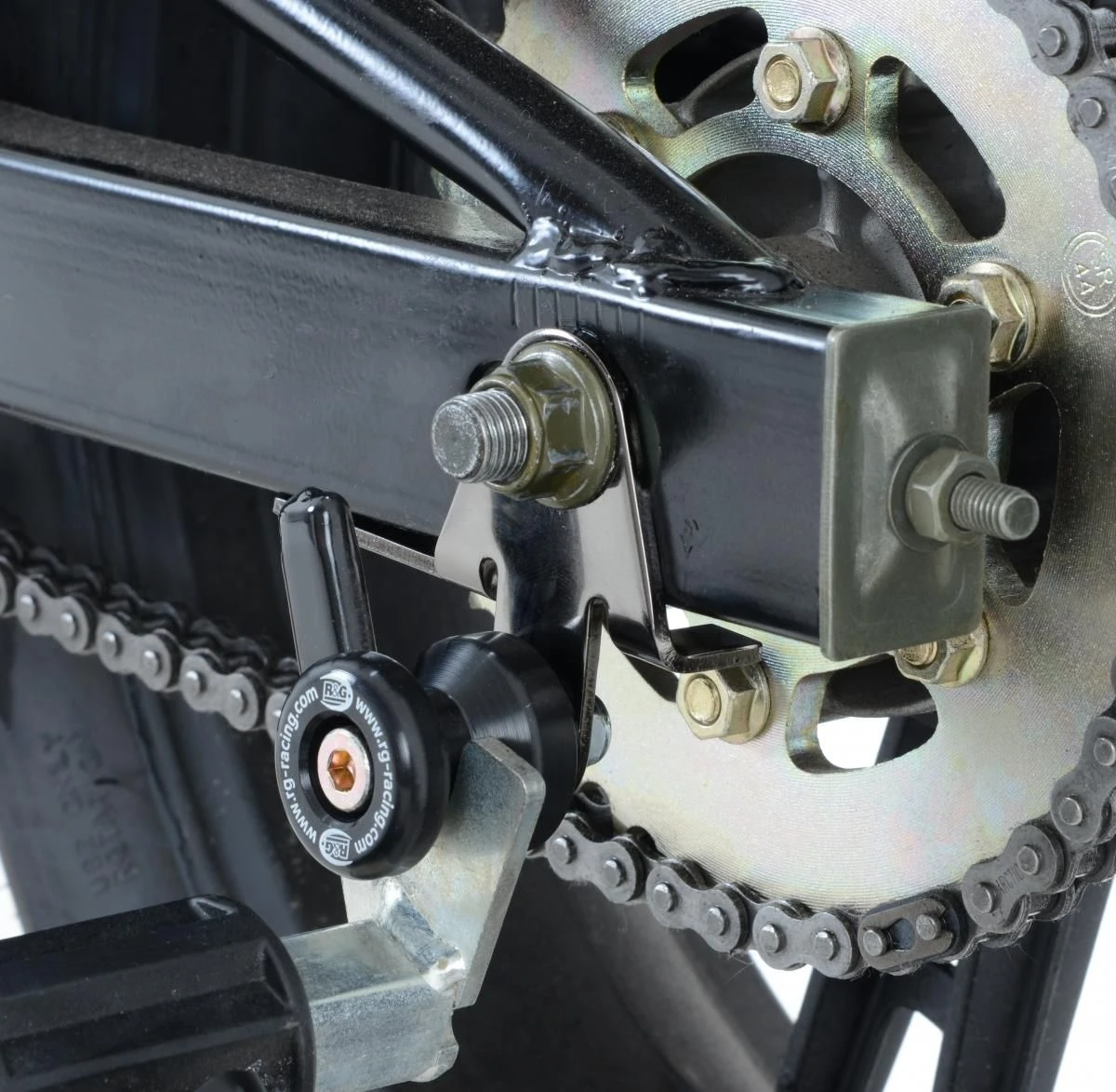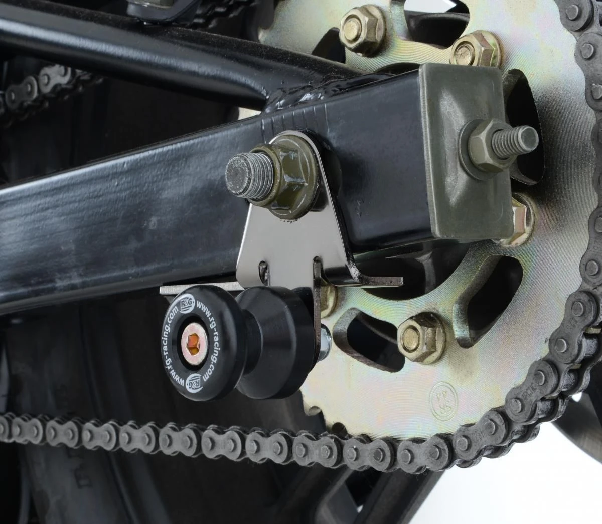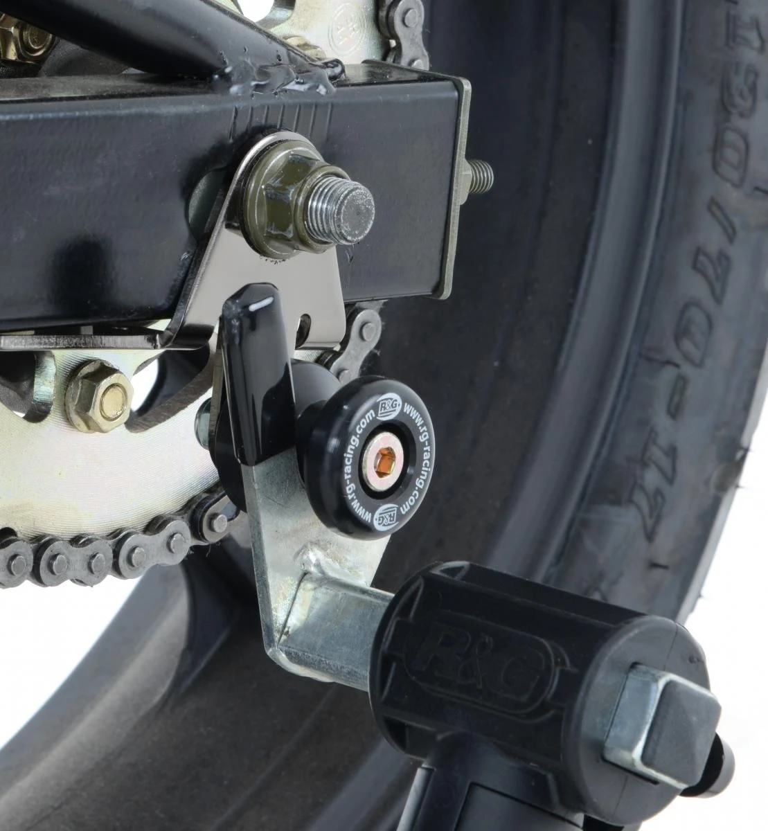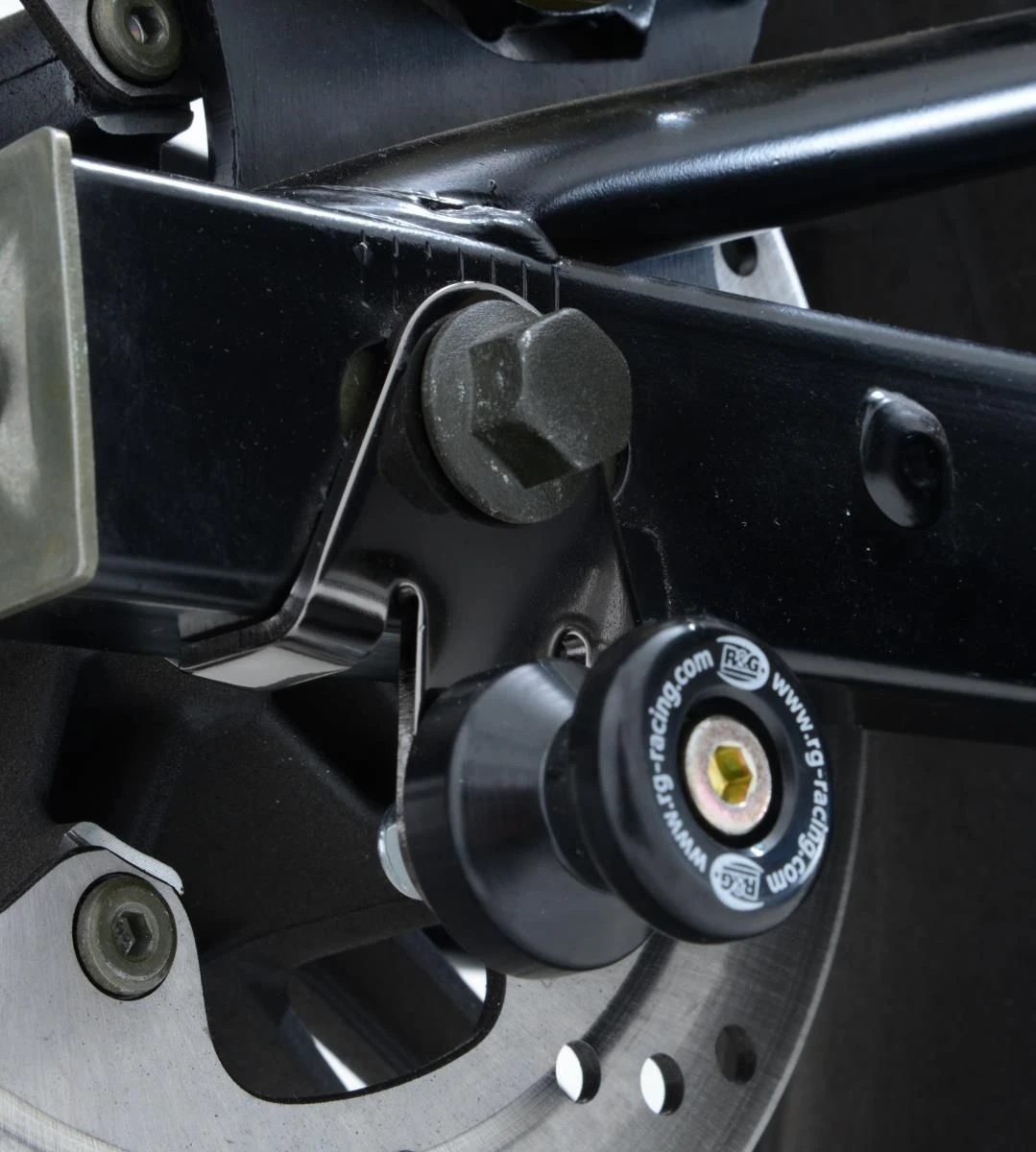 Wanneer er geen schroefdraad in de achterbrug is om een bobbin te monteren kan de R&G “Offset Cotton Reels” gebruikt worden. Zo kan er via de kettingspanner/achteras toch een bobbin op de motor gemonteerd worden en kan de motor dus met een paddockstand veilig en stevig gestald worden. Ook beschermen de bobbins de achterbrug bij een val.